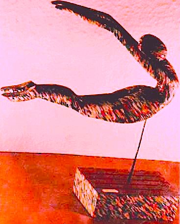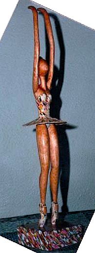 Vers 17h00, inspiré et impatient, je suis parti chercher du bois dans une construction. Je suis rentré chez moi vers 19h00 et j’ai commencé à sculpter. J’ai travaillé toute la nuit sans relâche, jusqu’à 8h00 du matin, lorsque ma première sculpture fut achevée. C’est celle que vous voyez en haut de la page, malheureusement volée à l’aéroport de São Paulo en 2006.